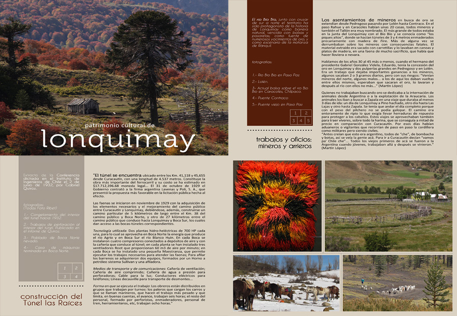 Uno de los productos más relevantes del proyecto, en el que se enmarca la producción de este archivo digital, es la revista Lonquimay Patrimonial. Son 40 páginas a color, en formato apaisado, que reúnen imágenes de distinta época y textos que proponen una mirada amplia sobre el patrimonio cultural de Lonquimay.