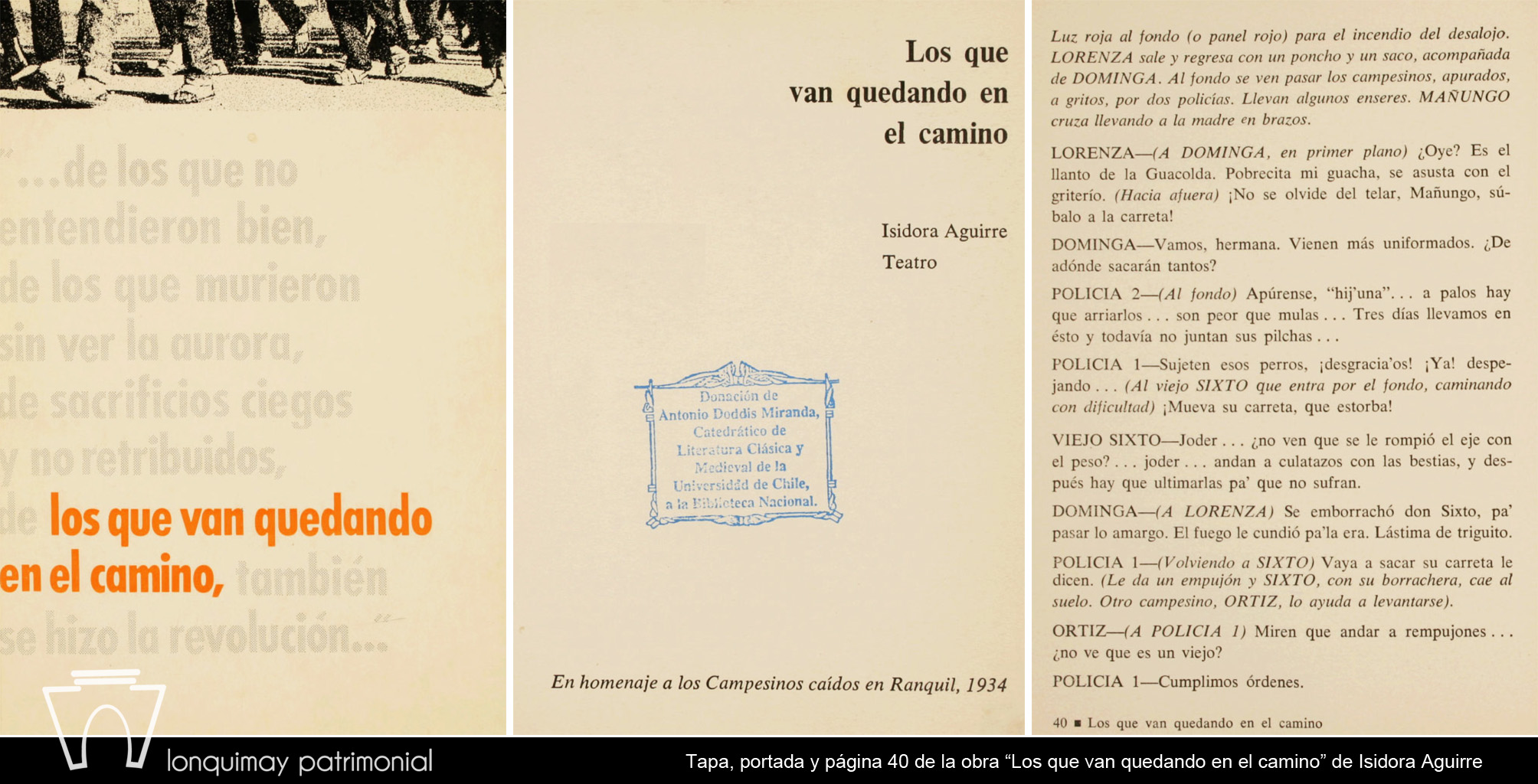 El 6 de julio de 1934 acontece en las cercanías de Ránquil, al norte de Lonquimay, una violenta represión por parte de la policía chilena sobre grupos de campesinos de la zona que se habían levantado en demanda de tierras. Aún siendo de importancia dentro de la historia de Chile, en la primera mitad del siglo XX, la Revuelta de Ránquil es un hecho escasamente documentado. Lo ocurrido entre junio y julio de ese año en Lonquimay a penas ha sido estudiado y no existe una fuente clara a partir de la cual poder tener luces sobre la verdad de los sucesos que detonaron el conflicto así como la forma en que éste se finalizó. Sin embargo, estos sucesos de violencia, cruzados por elementos sociales ligados a la propiedad de la tierra campesina se perpetúan en la memoria colectiva chilena a través del arte, principalmente de la literatura, siendo al menos tres obras las que tocan el tema directamente. La más conocida de ellas a nivel nacional es la pieza dramática “Los que van quedando en el camino” de Isidora Aguirre, escrita en el año 1970 y para cuya creación la autora “convivió con los habitantes de Ránquil y recopiló numerosos testimonios de los sobrevivientes de la masacre”.